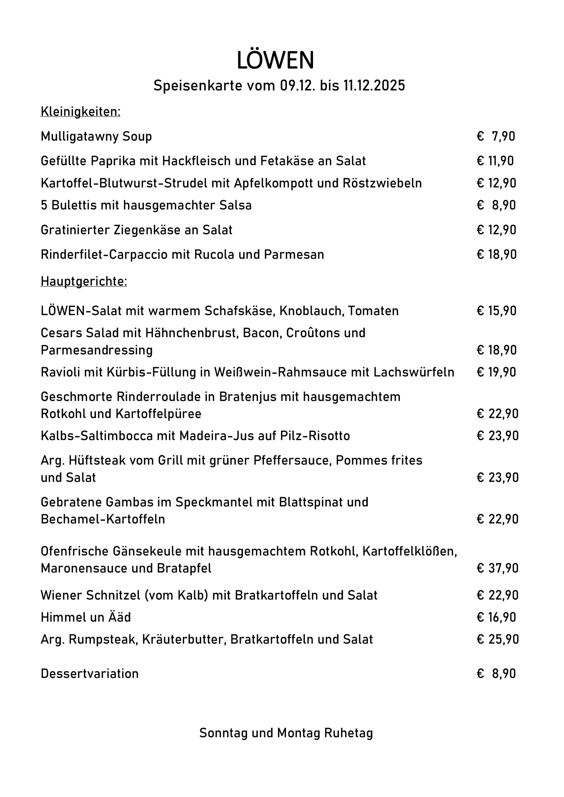 Sonntags und Montags Ruhetag.