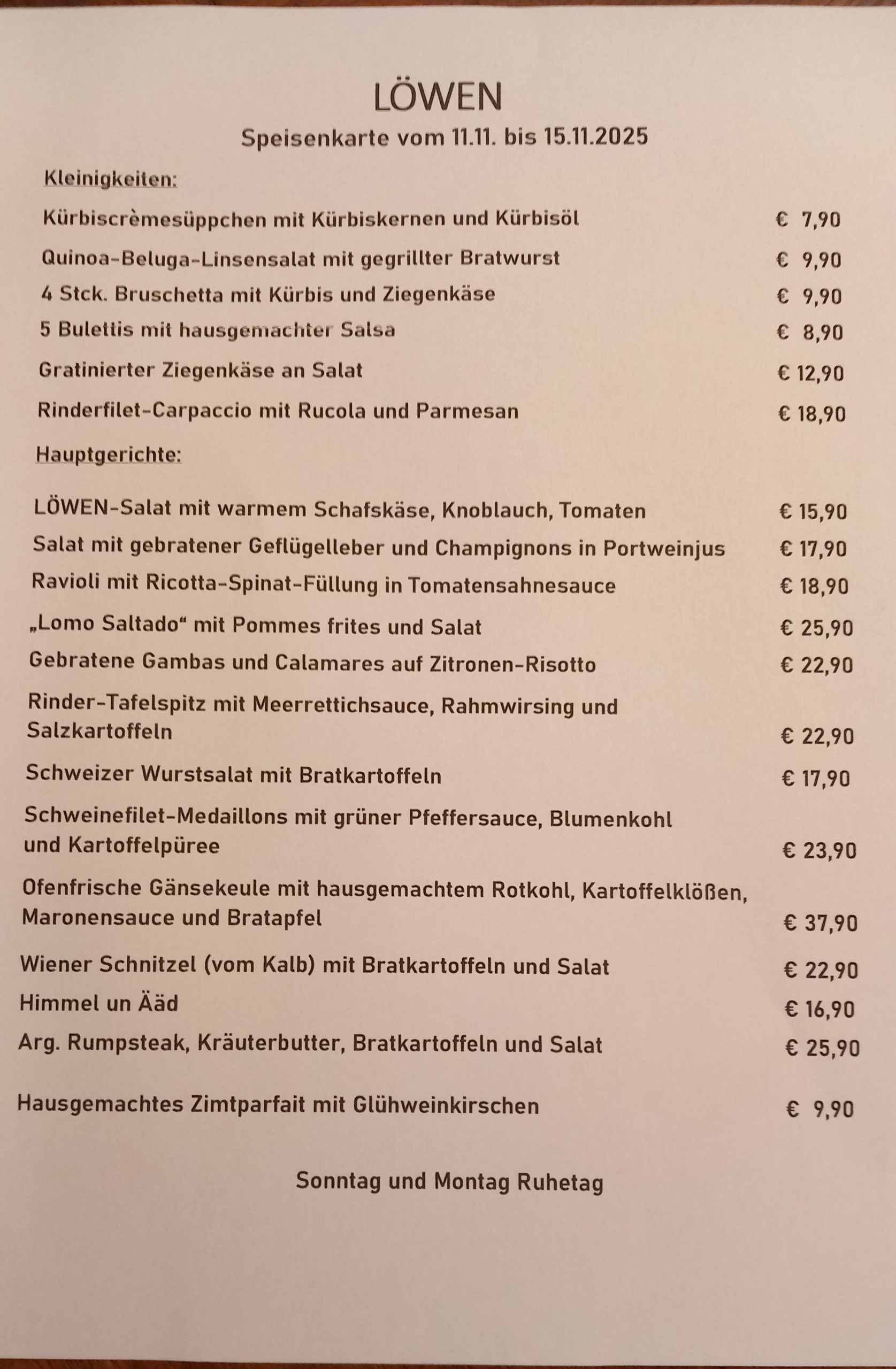 Sonntags und Montags Ruhetag.