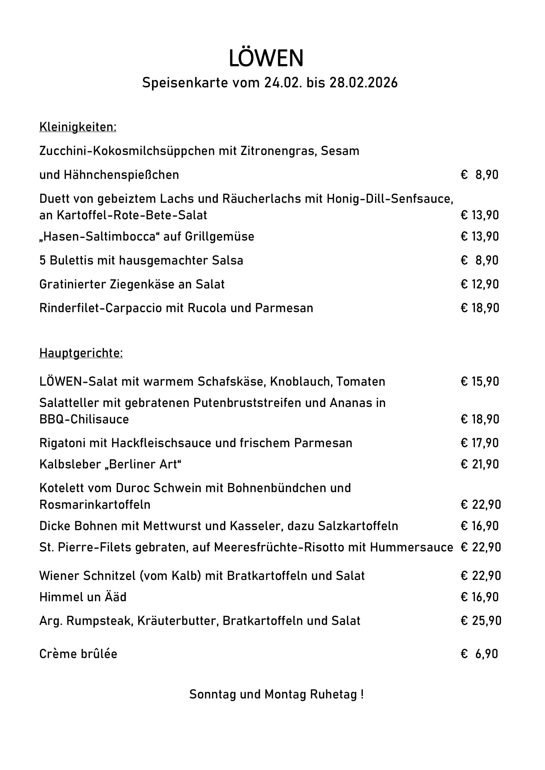 Sonntags und Montags Ruhetag.