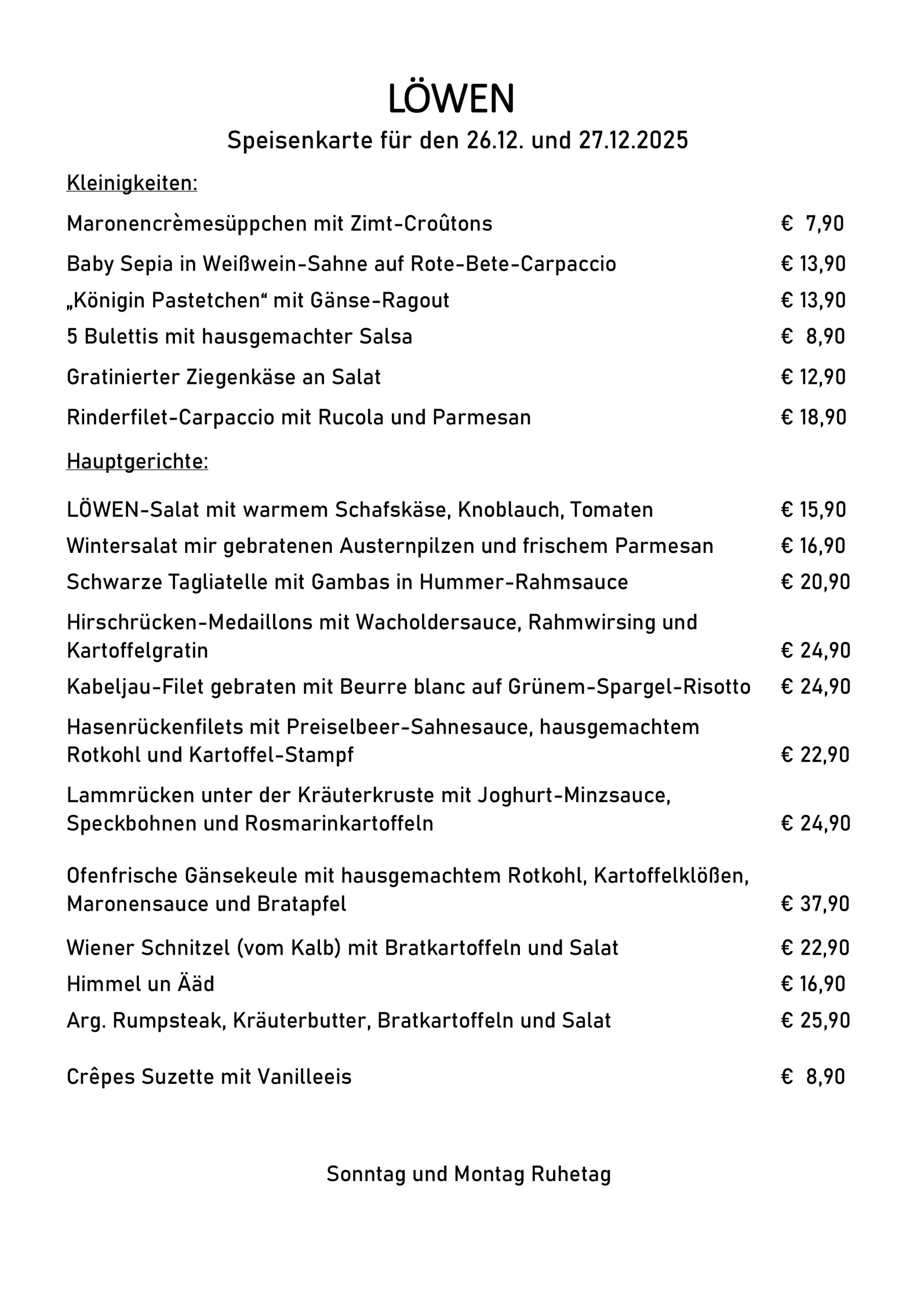 wir haben am 26. und 27.12.2025 ab 17.00 Uhr geöffnet.