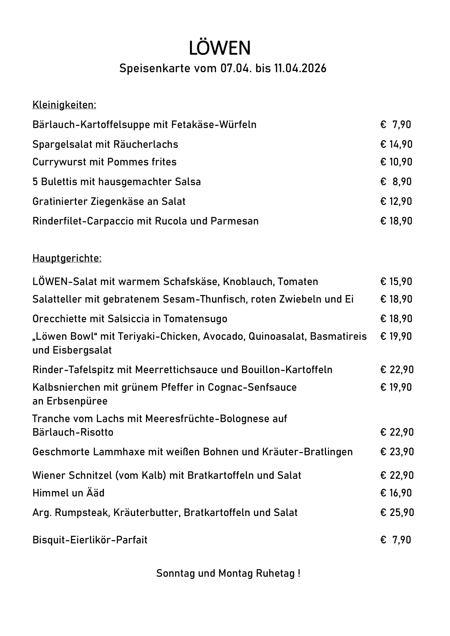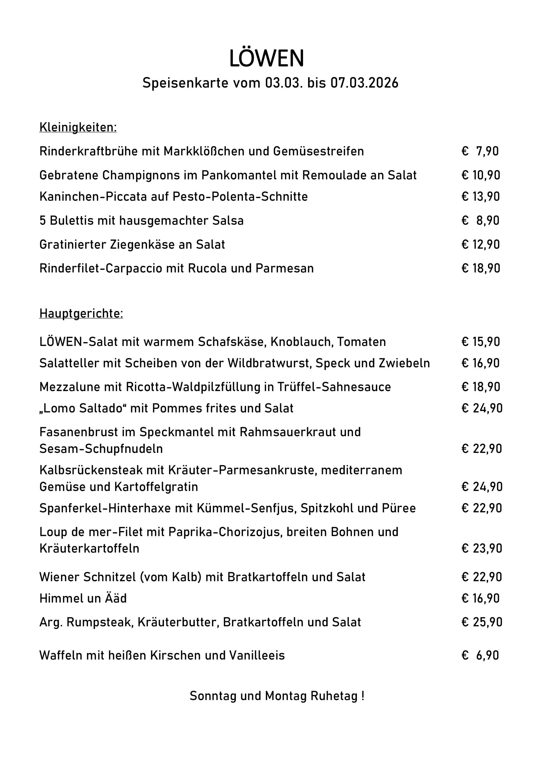 Sonntags und Montags Ruhetag.